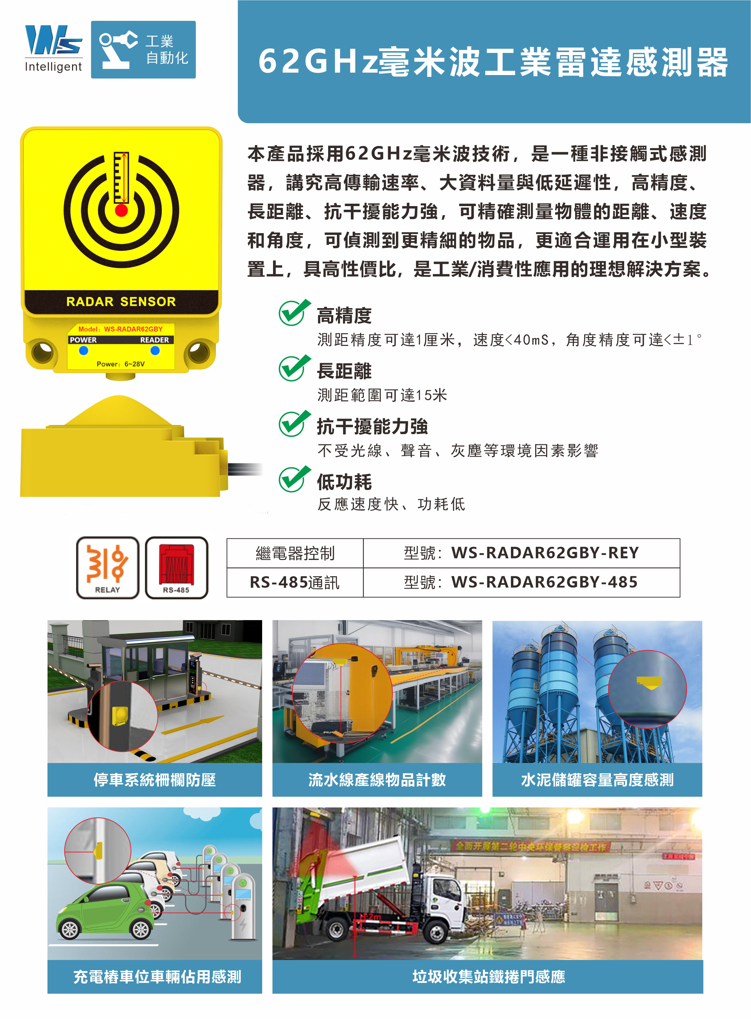62GHz毫米波工業雷達感測器 WS-RADAR62GBY 適用於各種車輛偵測,或物體精確距離測量或計數。探測雷達、位移感應、交通監控、接近傳感、安全和監控、工廠自動化安全防護裝置、液位元發送器、電動自行車、停車場、物品計數器、物料檢測、水位高度偵測、充電樁車位偵測…等應用。