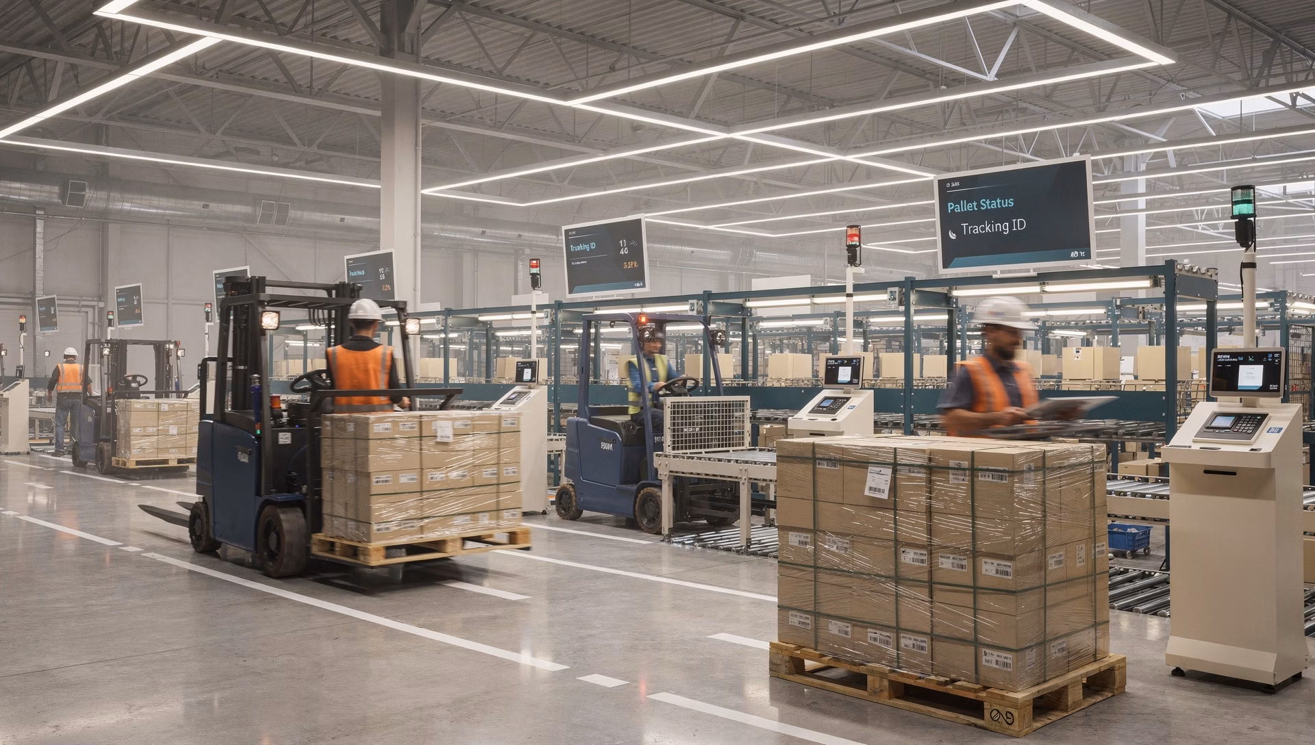 系統透過天花板基站、叉車定位器及棧板 RFID 標籤協同運作,精準實現棧板與機具的即時定位與動態管理,讓您全面掌握每一個環節。