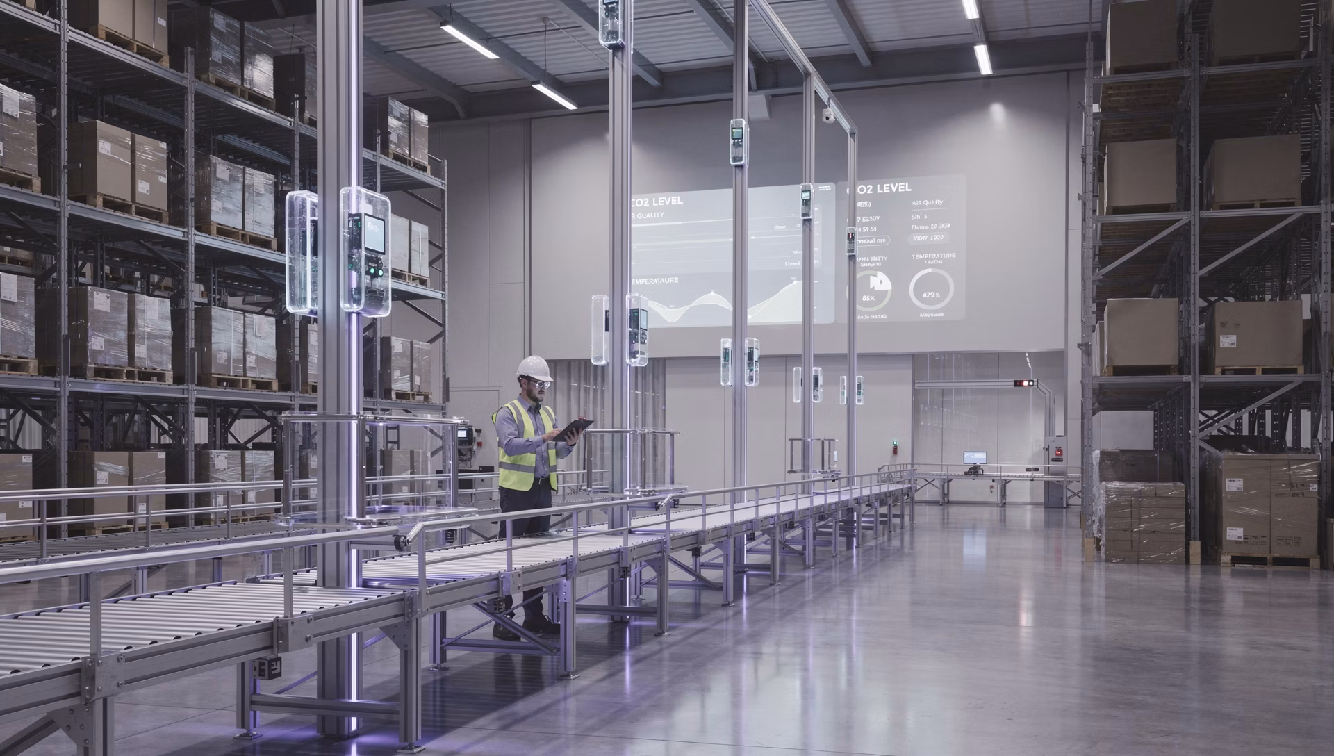 支援 CO₂ 濃度偵測、設備傾斜警報、人員與車輛計數,打造全方位的工作場所安全防護網,符合 ESG 永續經營目標。